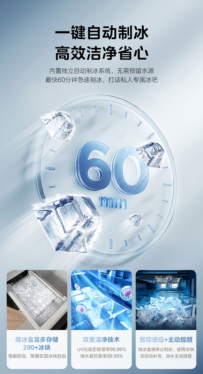 用户对于制冰需求的增长,曾长期伴随着“冰块是否干净”的深层焦虑。传统冰箱制冰过程漫长,且模具、储冰盒易成为细菌温床;部分冰箱产品为追求制冰速度,牺牲了卫生保障,使用户体验参差不齐。